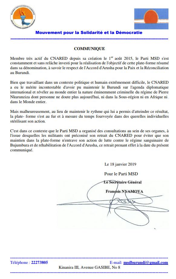 Le parti MSD se retire de la plateforme CNARED-GIRITEKA « pour éviter que son maintien dans cette plate-forme n’entrave son action de lutte contre le régime sanguinaire de Bujumbura & la réhabilitation de l’accord d’Arusha » après avoir constaté que cette plateforme « se fourvoie au fur et à mesure du temps dans des querelles individuelles stérilisant son action.»