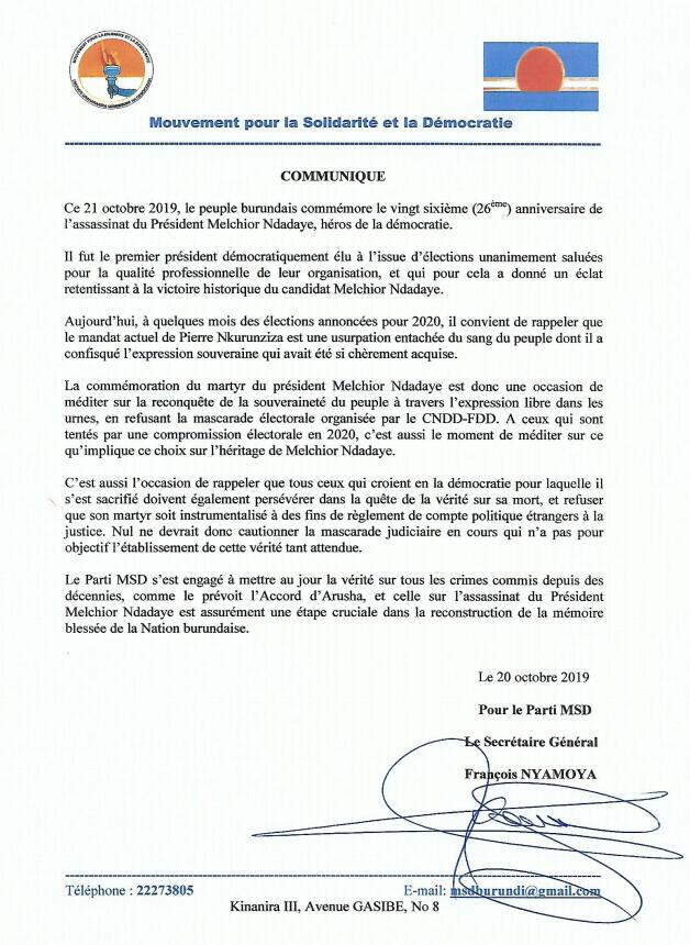 Communiqué du Parti MSD à l’occasion du 26ème anniversaire commémorant l’assassinat du Président Melchior Ndadaye,