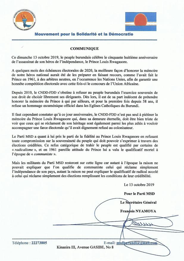 Vérité – Humilité – HumanitéCommuniqué du Parti MSD à l’occasion du 58e Anniversaire d’assassinat du Prince Louis Rwagasore
